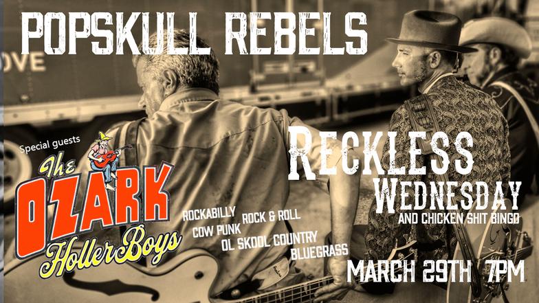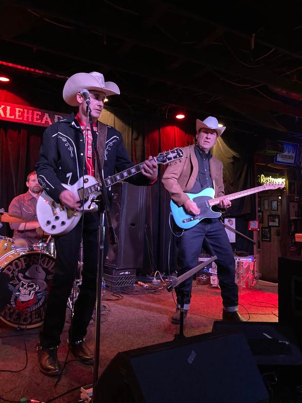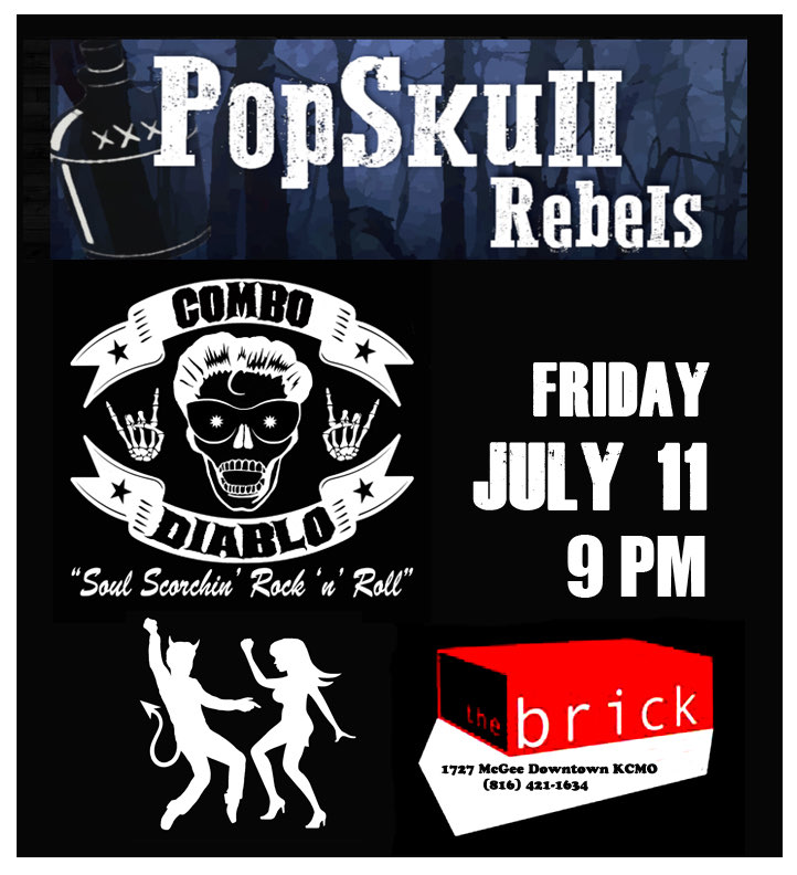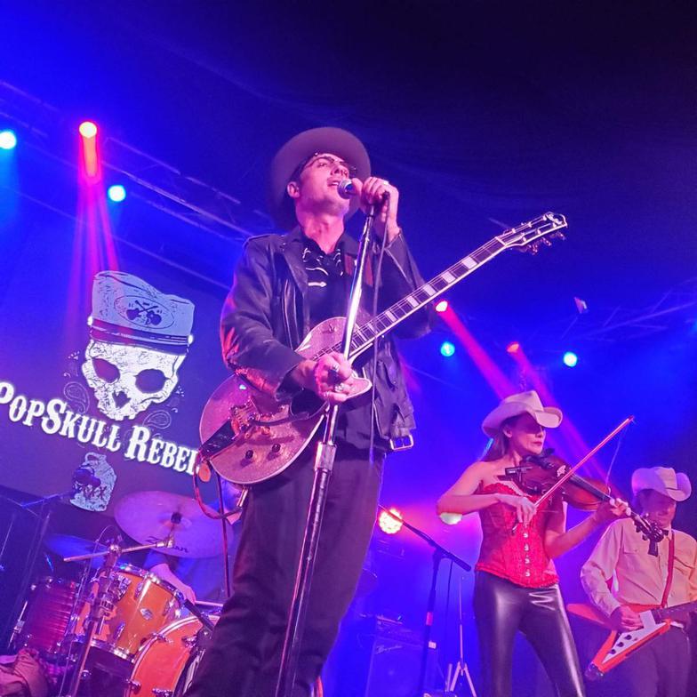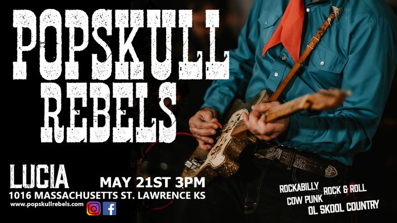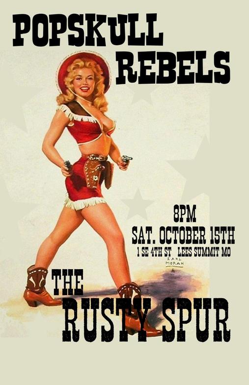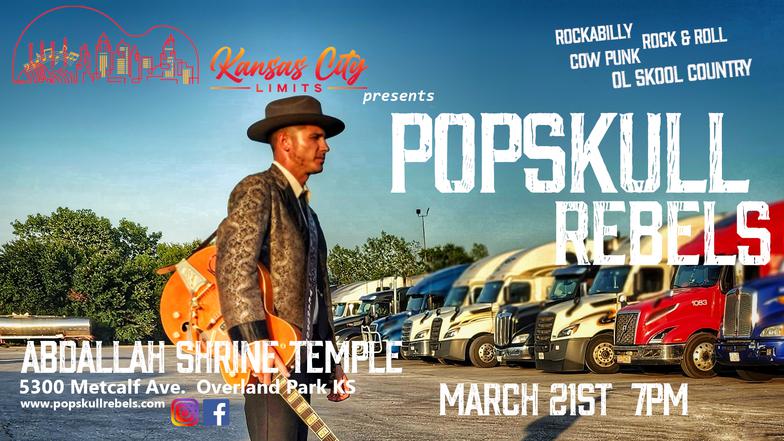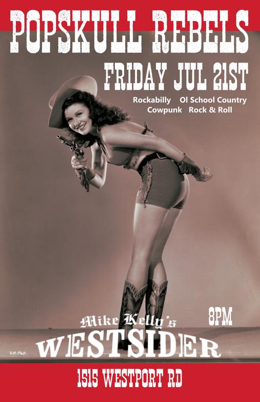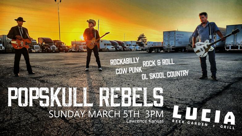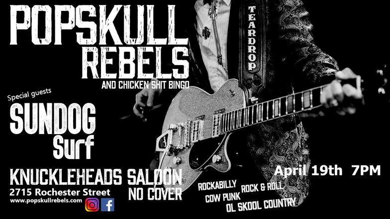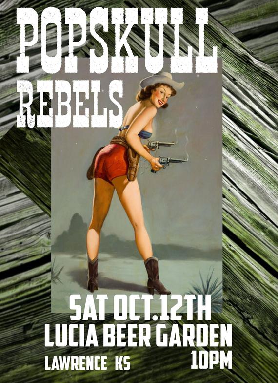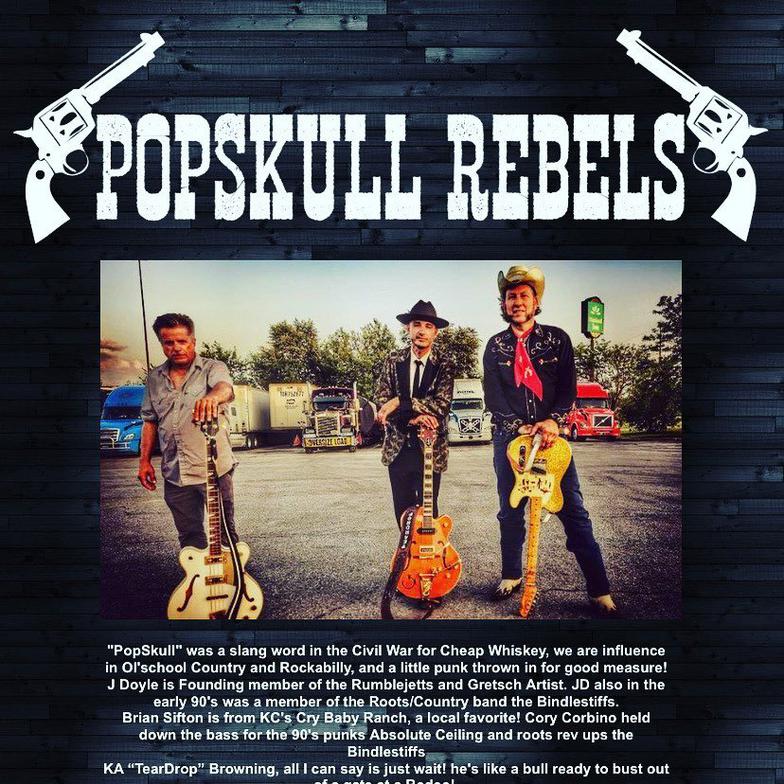 "PopSkull" was a slang word in the Civil War for Cheap Whiskey, we are influence in Ol'school Country and Rockabilly, and a little punk thrown in for good measure! J Doyle is Founding member of the Rumblejetts and Gretsch Artist. JD also in the early 90's was a member of the Roots/Country band the Bindlestiffs,Brian Sifton is from KC's Cry Baby Ranch, a local favorite! Cory Corbino held down the bass for the 90's punks Absolute Ceiling and roots rev ups the Bindlestiffs, KA “TearDrop” Browning, all I can say is just wait! he's like a bull ready to bust out of a gate at a Rodeo! The Rebels have graced the stages opening for Junior Brown, The Smithereens, Reverand Horton Heat, The Vandoliers, Big Sandy,